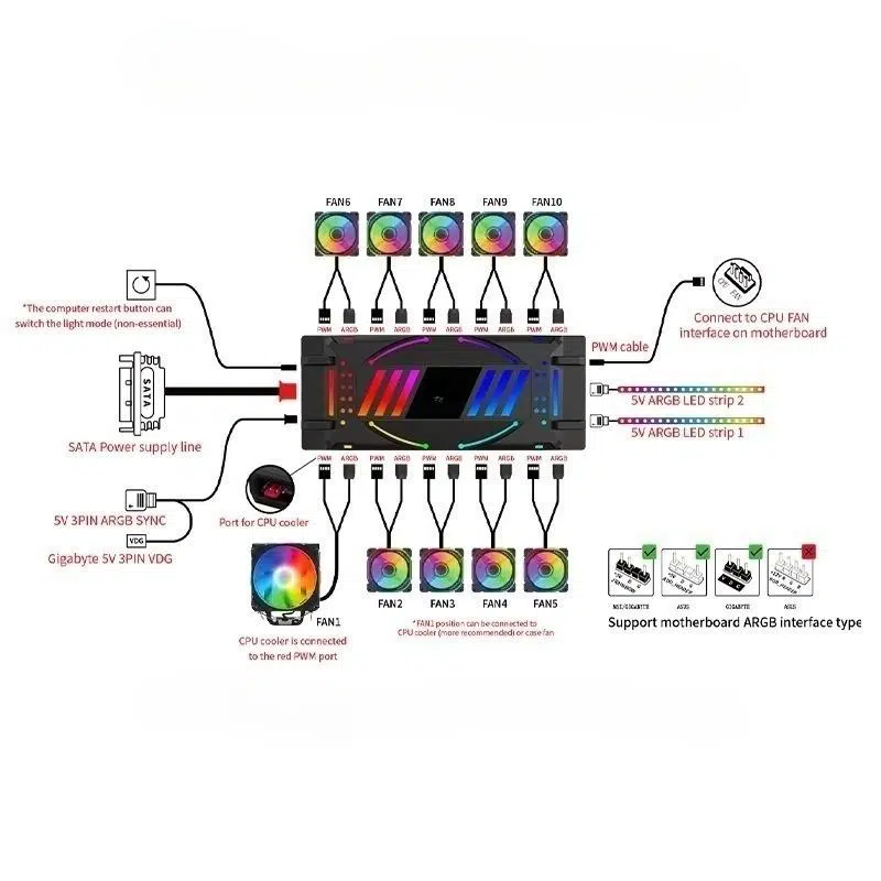 PC'nizdeki RGB aydınlatmayı kolayca kontrol etmek ve özelleştirmek için Snt Uzaktan Kumandalı ARGB Kontrol Cihazı'nı kullanın. Bu kullanışlı cihaz, hem PWM hem de ARGB bağlantı noktalarına sahiptir, böylece çeşitli fanlar ve LED şeritleri bağlayabilirsiniz.